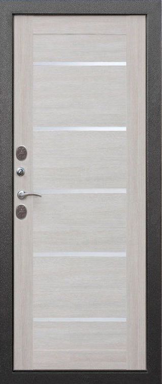 Входная дверь с применением технологии терморазрыва имеет конструкция, при которой металл с внутренней стороны двери не соприкасается с металлом стороны внешней (за счет двухкамерной термовставки), что препятствует появлению наледи и исключает промерзание*.